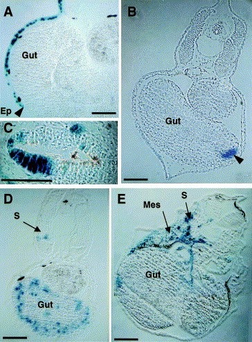 Fig. 3. Histological analysis of embryos reveals the distribution of the labelled cells in embryos from the experiments depicted in Fig. 2. (A) Descendants of a control A-tier cell injected only with β-galactosidase mRNA are found in the epidermis (Ep) and are absent from the underlying gut. (B) If the cell is additionally injected with Xsox17β, there is no contribution to the epidermis, and clones of cells (arrowed) are found integrated into the gut endoderm. (C) These clones can be seen to be part of a histologically normal structure, as is shown by a section through the hindgut region where lineage labelled cells are indistinguishable from their unlabelled neighbours. (D) D-tier cell descendants are predominantly found in the gut endoderm with a smaller contribution to mesodermal derivatives such as somite (S). (E) Co-injection of Xsox17β::EnR results in a much reduced endodermal contribution, with more extensive localisation in lateral mesoderm (Mes), including somites (S) mesenchyme, and paired cardinal veins. Scale bar, 100 μm.