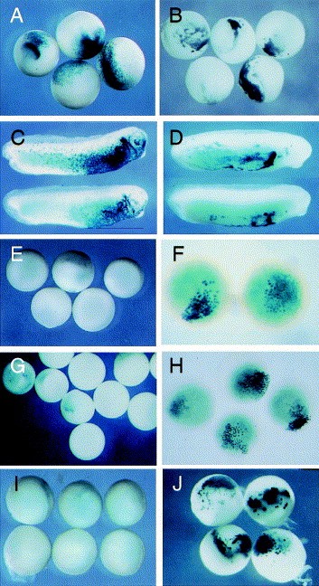 Fig. 4. The behaviour of lineage labelled cells during embryogenesis. (A) At stage 19 (late neurula) A-tier-derived clones are dispersed in the epidermis. (B) A-tier descendants expressing Xsox17β, however, tend to aggregate at this stage, producing dense swirling patterns. Superficial cells are still evident in these embryos at tailbud stages (D), although the number of labelled cells is reduced relative to the controls (C). Control D-tier clones (E), and those expressing Xsox17β::EnR (G), are internal during gastrula stages, and can only be visualised in cleared embryos (stage 10.5, (F) controls, (H) Xsox17β::EnR). By stage 19, control clones remain internal (I), while cells expressing Xsox17β::EnR are appearing on the surface of the embryo (J).