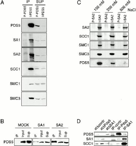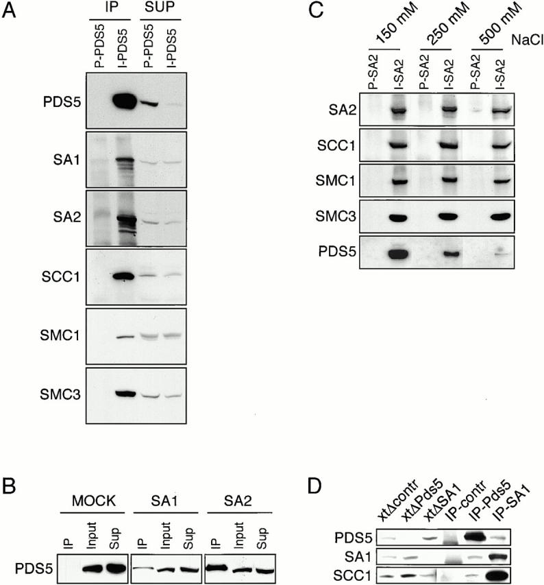 Figure 4. PDS5 is found in association with SA1- and SA2-containing cohesin complexes. (A) Low-speed supernatant of extracts from logarithmically growing HeLa cells was analyzed by immunoprecipitation with either preimmune (P) or immune antibodies (I) to PDS5. Immunoprecipitates (IP) and supernatants (SUP) were analyzed by SDS-PAGE and Western blotting with antibodies to the indicated proteins. (B) HeLa extracts prepared as in A were analyzed by immunoprecipitation with SA1, SA2, or with nonspecific control (MOCK) antibodies and the immunoprecipitates (IP), extracts before immunoprecipitation (Input) and supernatants (Sup) were analyzed by SDS-PAGE and Western blotting with antibodies to PDS5. (C) HeLa extracts prepared as in A were analyzed by immunoprecipitation with either preimmune (P) or immune (I) SA2 antibodies (446). After washing with buffers containing either 150, 250, or 500 mM NaCl, the immunoprecipitates were analyzed by SDS-PAGE and Western blotting with antibodies to the indicated proteins. (D) Xenopus interphase extracts were analyzed by immunoprecipitation with either nonspecific (IP-contr), Xenopus PDS5 (IP-PDS5), or SA1 (IP-SA1) antibodies. The precipitates were analyzed by immunoblotting with PDS5, SA1, and SCC1 antibodies. After immunoprecipitation with control (xtΔcontr), PDS5 (xtΔPDS5), or SA1 (xtΔSA1) antibodies the resulting supernatants were analyzed side by side. PDS5 antibody 648 was used for the IP and 647 for immunoblotting.