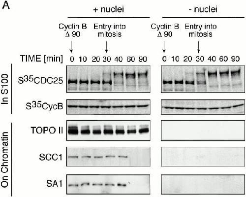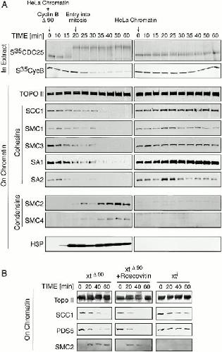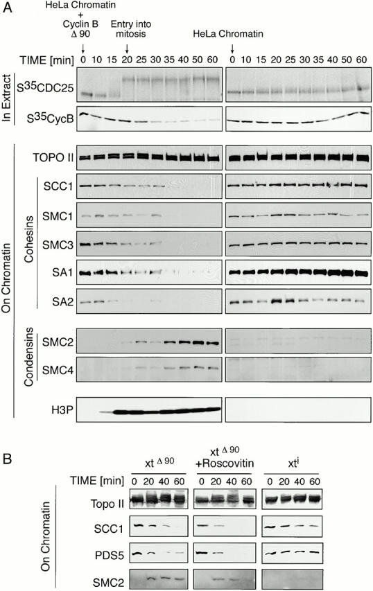Figure 5. Reconstitution of mitosis-specific dissociation of human 14S cohesin complexes and of PDS5 from chromatin in Xenopus egg extracts. (A) HeLa chromatin was incubated in Xenopus interphase extract. The extract was either supplemented with nondegradable cyclin B Î90 to trigger entry into mitosis (left) or left untreated (right). At different time points either extract samples (top) or chromatin reisolated from the extract by sucrose cushion centrifugation (bottom) were analyzed by SDS-PAGE and either PhosphorImaging (top) or immunoblotting with antibodies to the indicated proteins (bottom). The cell cycle state of the extracts was analyzed by monitoring the phosphorylation-dependent electrophoretic mobility shift of 35S-labeled CDC25 and the stability of 35S-labeled cyclin B, which were added to the extracts at time zero. TOPO II, topoisomerase II; H3P, histone H3 phosphorylated on serine 10. (B) HeLa chromatin was incubated in mitotic Xenopus egg extract (xtÎ90), or in mitotic extract treated with 0.8 mM roscovitin (XÎ90+ Roscovitin), or in interphase extract (xti). Chromatin bound proteins were isolated at different time points and analyzed as in A.