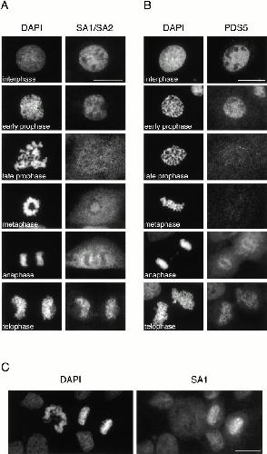 Figure 6. Immunofluorescence microscopy showing the intracellular distribution of SA1, SA2, and PDS5 in human cells at different stages of mitosis. Caco cells were stained with DAPI and with either the SA1/SA2 antibody 447 (A), or with PDS5 antibodies (B), or with the SA1-specific antibody 444. Similar results were obtained with the antibodies 445 and 446 (data not shown). Bars, 5 μm.
