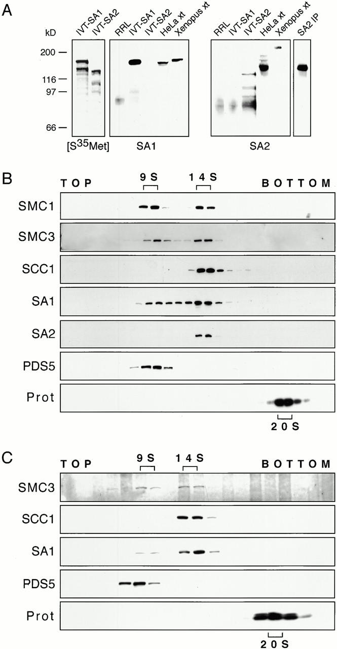 Figure 1. Fractionation of human cohesin complexes by sucrose density gradient centrifugation. (A) Characterization of SA1 and SA2 antibodies. (Left) PhosphorImager scan of in vitro–translated 35S-labeled human SA1 and SA2 (IVT-SA1, IVT-SA2) separated by SDS-PAGE. Other panels, control rabbit reticulocyte lysate (RRL), in vitro–translated SA1 and SA2, protein extracts (xt) from HeLa cells, and Xenopus interphase egg extracts, and SA2 (446) immunoprecipitates isolated from HeLa extracts (SA2 IP) were analyzed by SDS-PAGE and immunoblotting with specific SA1 (444) or SA2 (446) antibodies. (B) Sucrose gradient fractions containing proteins from logarithmically growing HeLa cells were analyzed by SDS-PAGE and immunoblotting with antibodies to the indicated proteins. SA1 and SA2 were detected with antibodies 444 and 446, respectively. Prot, proteasome. (C) Sucrose gradient fractions containing proteins from Xenopus interphase extract were analyzed by SDS-PAGE and immunoblotting with antibodies to the indicated proteins.