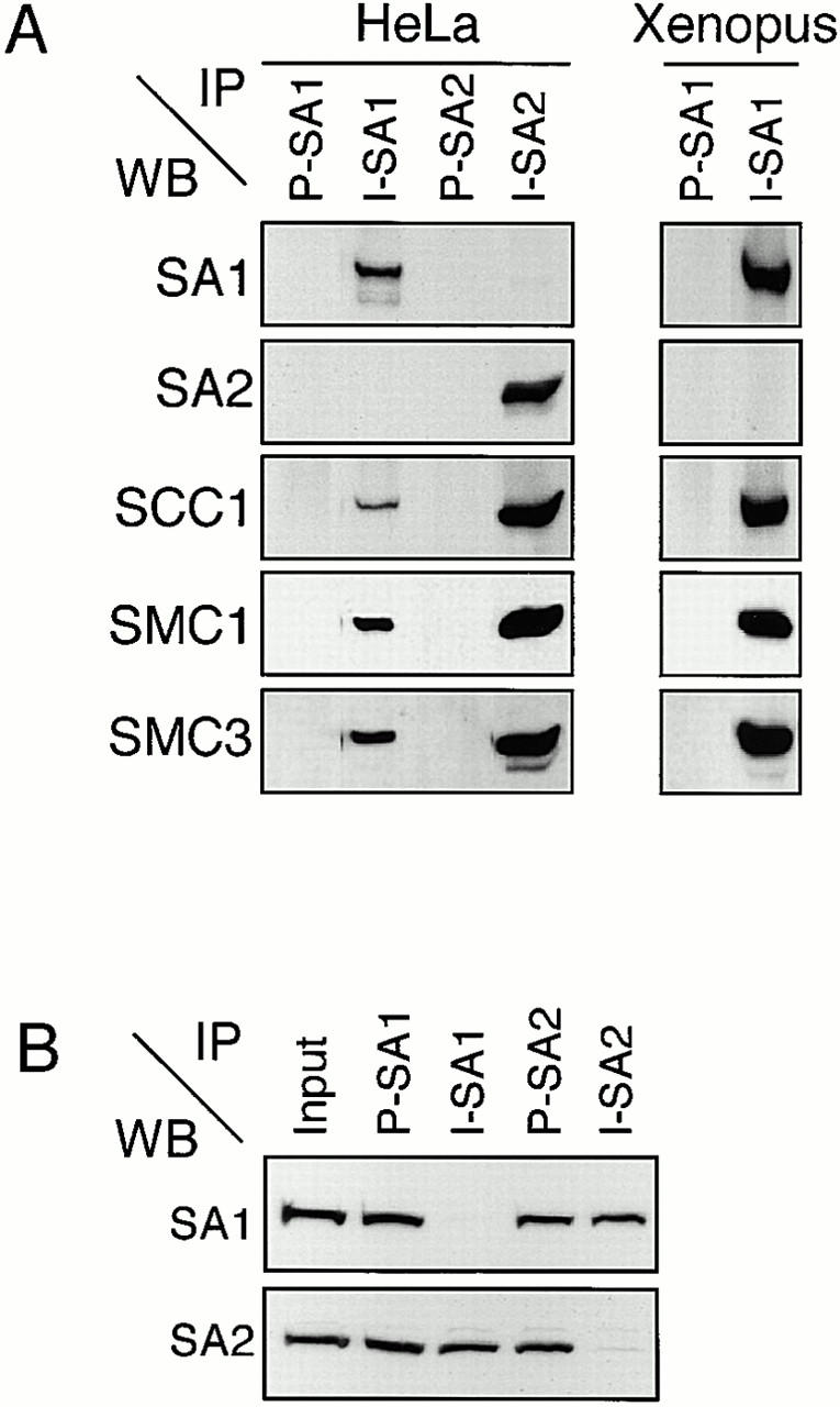 Figure 2. SA1 and SA2 are subunits of two distinct human 14S cohesin complexes. (A) Low-speed supernatant of extracts from logarithmically growing HeLa cells or Xenopus interphase egg extracts were analyzed by immunoprecipitation (IP) with either preimmune (P) or immune antibodies (I) against SA1 (444) or SA2 (446) and analyzed by SDS-PAGE and Western blotting (WB) with antibodies to the indicated proteins. (B) HeLa extracts were immunodepleted as in A and the resulting supernatant fractions were analyzed by SDS-PAGE and immunoblotting with SA1 (444) and SA2 (446) antibodies.