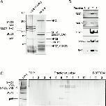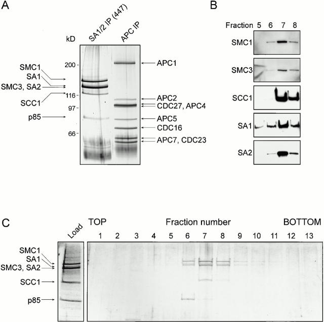 Figure 3. Purification of human cohesin complexes. (A) Immunoprecipitates (IP) obtained with either SA1/2 (447) antibodies or as a control with CDC27 antibodies (APC IP) from low-speed supernatant of extracts from logarithmically growing HeLa cells were analyzed by SDS-PAGE and silver staining. The positions of cohesin subunits, p85 and APC subunits as determined by immunoblotting are indicated. (B) Proteins were eluted with antigenic peptides from cohesin immunoprecipitates obtained as in A and further separated by sucrose density gradient centrifugation. Fractions 5–8 were analyzed by SDS-PAGE and immunoblotting with antibodies to the indicated proteins. (C) Sucrose density gradient fractions from the experiment shown in B were analyzed by SDS-PAGE and silver staining.