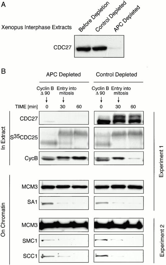 Figure 8. The APC is not required for the mitotic dissociation of cohesins from chromatin. (A) CDC27 immunoblot showing Xenopus interphase extract before and after depletion with either control or CDC27 antibodies. (B) APC-depleted (left) and control-depleted (right) Xenopus interphase extracts were incubated with sperm nuclei for 30 min and then nondegradable cyclin B Δ90 was added to trigger entry into mitosis. At different time points either extract samples (top) or chromatin reisolated from the reaction mixture by sucrose cushion centrifugation (bottom) were analyzed by SDS-PAGE and either PhosphorImaging (S35CDC25) or immunoblotting with antibodies to the indicated proteins (all other panels). The cell cycle state of the extracts was analyzed by monitoring the behavior of 35S-labeled CDC25 and of endogenous cyclin B. Data from two different experiments are shown. In experiment 2, the degree of APC depletion and the cell cycle behavior of the extracts were the same as in experiment 1 (data not shown).