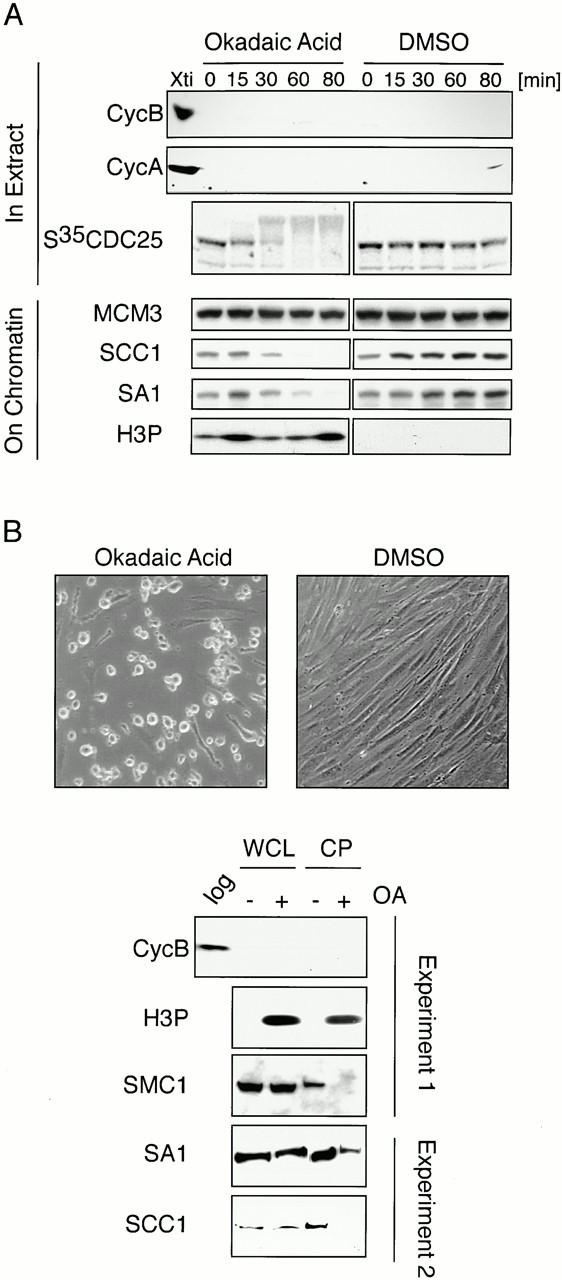 Figure 9. Cohesins can dissociate from chromatin in the absence of CDK1 activity. (A) Xenopus sperm nuclei (3,200 nuclei/μl) were incubated for 30 min at room temperature in interphase extracts from cycloheximide-treated Xenopus eggs before either 1 μM okadaic acid (left) or DMSO (right) was added. At different time points either extract samples (top) or chromatin reisolated from the reaction mixture by sucrose cushion centrifugation (bottom) were analyzed by SDS-PAGE and either PhosphorImaging (S35CDC25) or immunoblotting with antibodies to the indicated proteins (all other panels). The cell cycle state of the extracts was analyzed by monitoring the behavior of 35S-labeled CDC25 and the phosphorylation of histone H3 on serine 10 (H3P). (B) Phase contrast micrographs of human diploid fibroblasts grown to confluency and then treated for 2.5 h with 10 μg/ml cycloheximide and either with DMSO (right) or with 1 μM okadaic acid (left). Whole cell lysates (WCL) or chromatin pellets (CP) were then analyzed by SDS-PAGE and immunoblotting with antibodies to the indicated proteins (lower panels). Data from two different experiments are shown. OA, okadaic acid; H3P, histone H3 phosphorylated on serine 10.