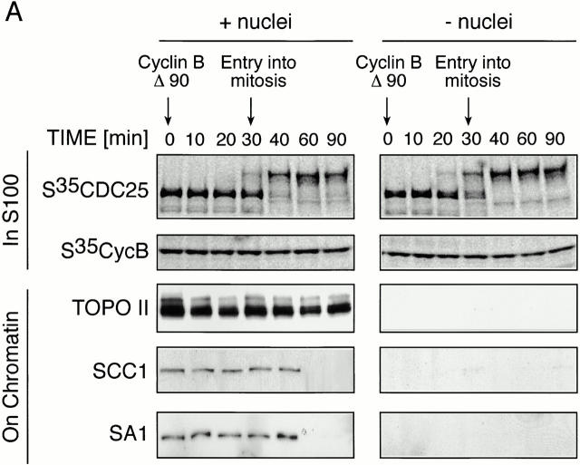 Cyclin B proteolysis is not required for the mitotic dissociation of cohesins from chromatin. (A) High-speed supernatant (S100) fractions of Xenopus interphase extracts were incubated for 60 min at room temperature either with 3,200 Xenopus sperm nuclei/ul (left) or without nuclei (right). Nondegradable cyclin B Î90 was then added to trigger entry into mitosis. At different time points either S100 samples (top) or chromatin reisolated from the reaction mixture by sucrose cushion centrifugation (bottom) were analyzed by SDS-PAGE and either PhosphorImaging (top) or immunoblotting with antibodies to the indicated proteins (bottom). The cell cycle state of the extracts was analyzed by monitoring the behavior of 35S-labeled CDC25 and cyclin B as in Fig. 5. TOPO II, topoisomerase II.