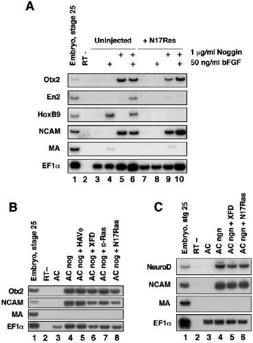 with XBF2 in combination with either XFD or N17Ras. RT-PCR was done on RNA isolated from 10 animal caps per condition. Stage 25