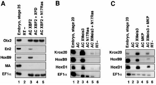 with 1 ng N17Ras (lane 5), and RT2 negative control (lane 6). (C) RT-PCR of animal caps injected with mRNA encoding XMeis3 in