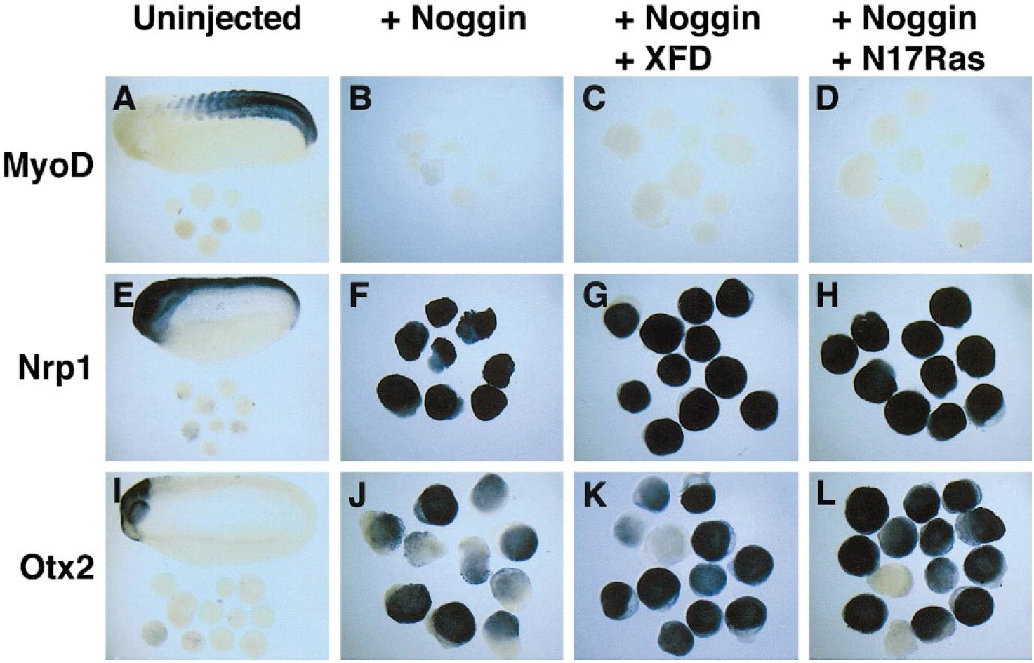 or noggin in combination with XFD but not when noggin is co-injected with N17Ras. The animal caps pictured in EâI were fixed 10 min