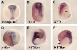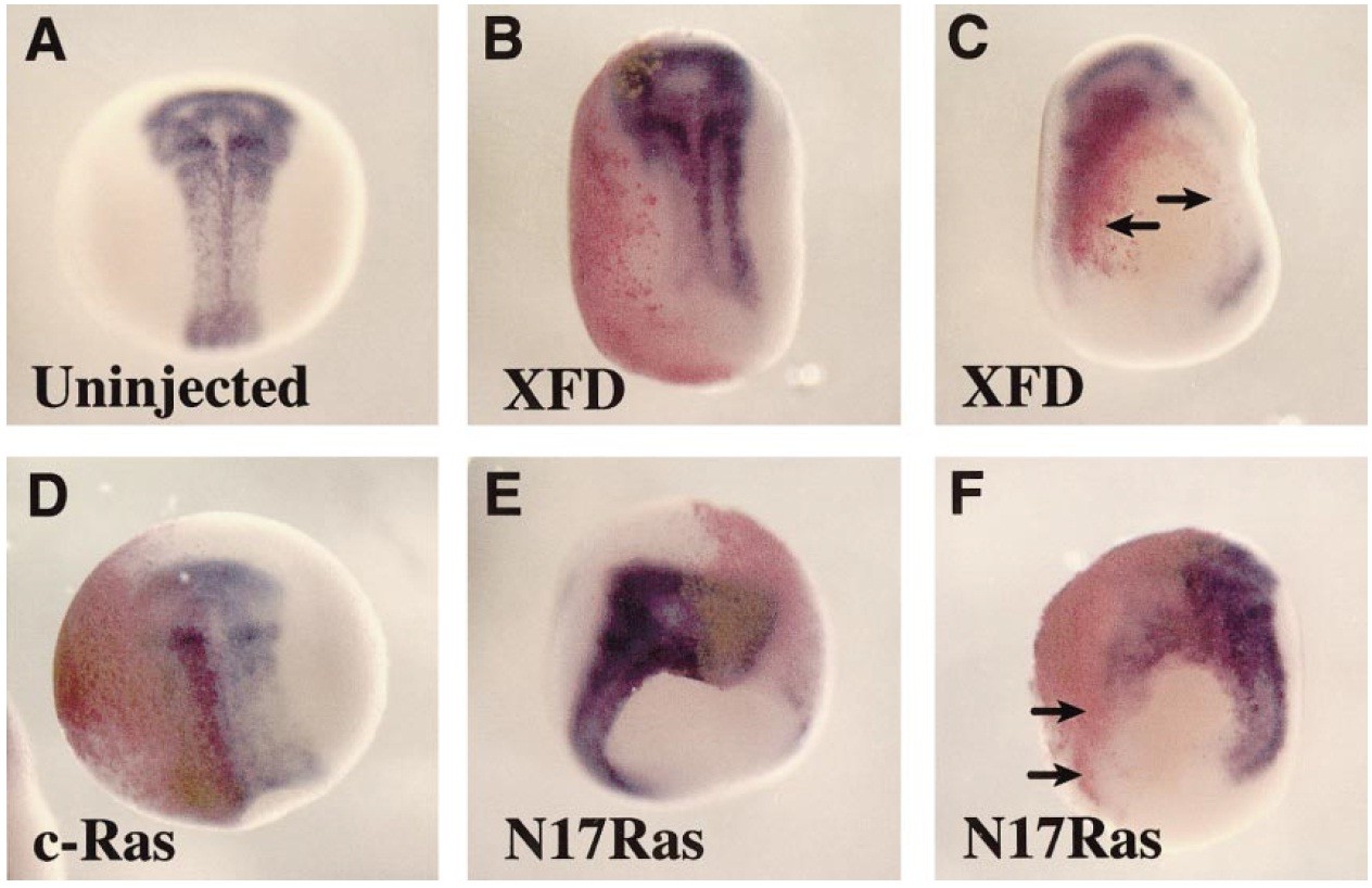 (E, F). If XFD (B) or N17Ras (E) injected mRNAs are expressed in the anterior portion of the neural plate then the expression of the general