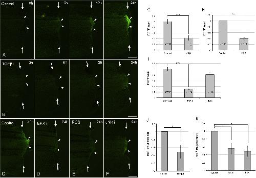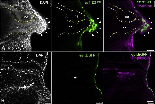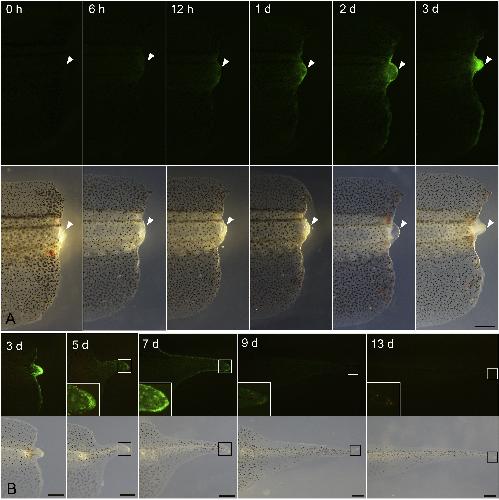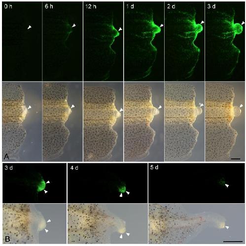 A transgenic reporter under control of an es1 promoter/enhancer marks wound epidermis and apical epithelial cap during tail regeneration in Xenopus laevis tadpole., Dev Biol 2018 |