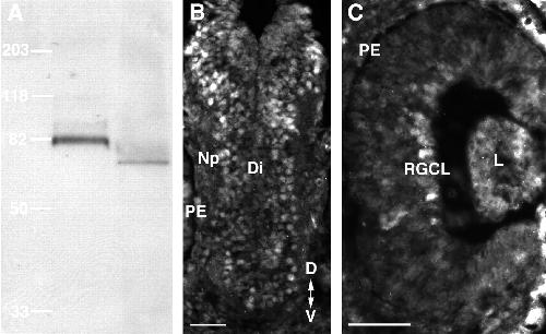 immunohistochemistry MN, DRG & other nuclei characterized extensively by immunocytochemistry; works in paraformaldehyde-fixed and paraffin-embedded tissue; does not work in methanol or acetone (see Sanders et al., 2003, and Georgia et al., 2006)