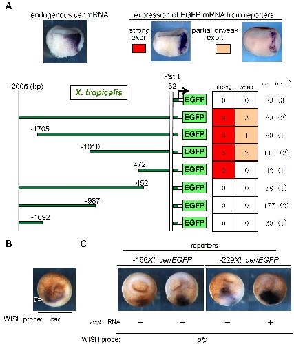 Dynamic in vivo binding of transcription factors to cis-regulatory modules of cer and gsc in the stepwise formation of the Spemann-Mangold organizer., Development 2012 |