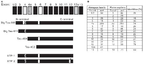 | Description | raised against a recombinant protein encoding the phylogenetically conserved carboxy terminal region of rat big tau [tau-30, amino acids 626â686 (Black et al., 1996)]. This domain is common to all alternative splice forms in both mammal and Xenopus, exhibiting 84% amino acid identity between rat (UniProtKB P19332) and X. laevis tau (GenBank, AY032847.1; gene symbol, mapt). |
