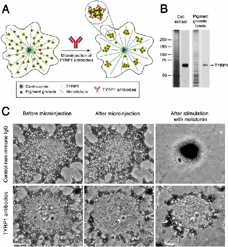 Description: TYRP1 antibodies were produced in the Rodionov Lab (Univ. Connecticut) by immunizing rabbits with a synthetic peptide that corresponded to the C-terminal amino acid sequence of the Xenopus laevis TYRP1 (see Rezaul et al., 2016). Antibodies against TYRP1 link neighboring pigment granules to each other, inducing formation of pigment granule clusters unable to efficiently move along MTs because of their large size.