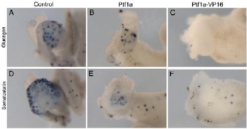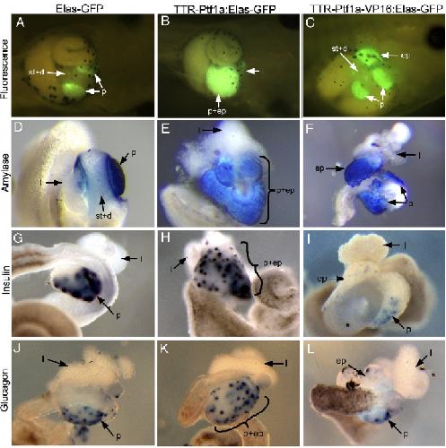 Differential ability of Ptf1a and Ptf1a-VP16 to convert stomach, duodenum and liver to pancreas., Dev Biol 2007 |