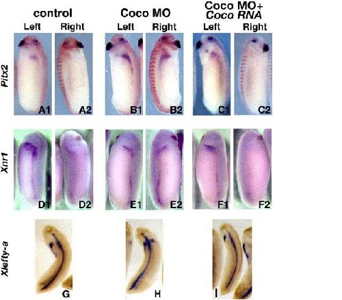 The left-right axis is regulated by the interplay of Coco, Xnr1 and derrière in Xenopus embryos., Dev Biol 2007 |