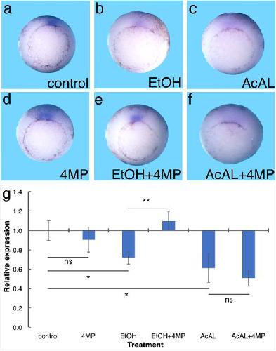 Ethanol exposure affects gene expression in the embryonic organizer and reduces retinoic acid levels.,