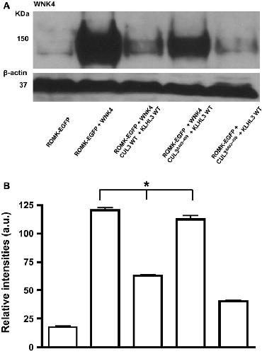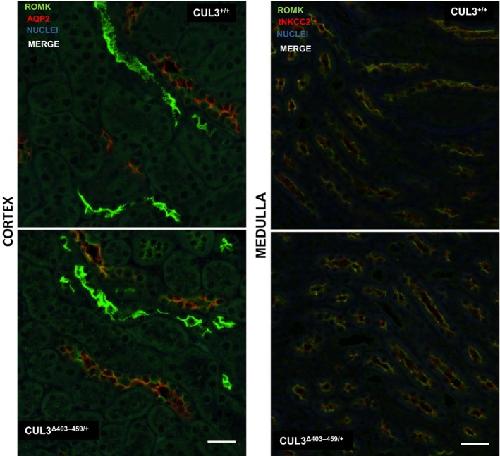 ROMK expression remains unaltered in a mouse model of familial hyperkalemic hypertension caused by the CUL3Δ403-459 mutation.,
