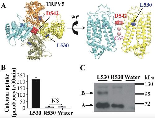 The L530R variation associated with recurrent kidney stones impairs the structure and function of TRPV5.,