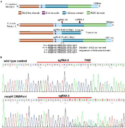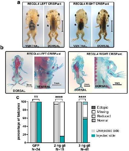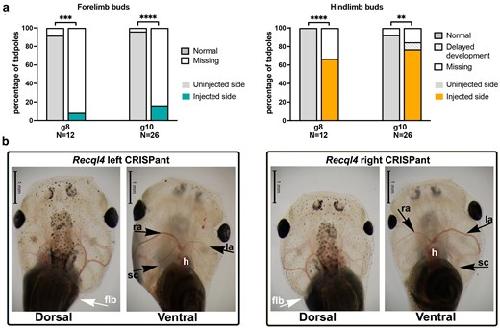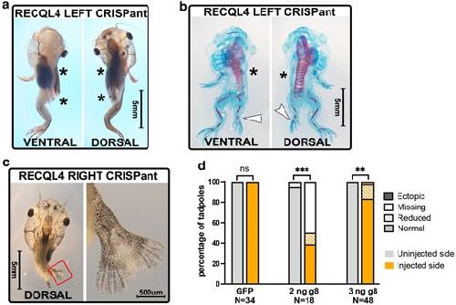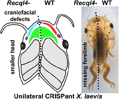 Unilateral loss of recql4 function in Xenopus laevis tadpoles leads to ipsilateral ablation of the forelimb, hypoplastic Meckel's cartilage and vascular defects.,