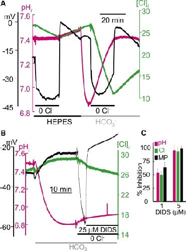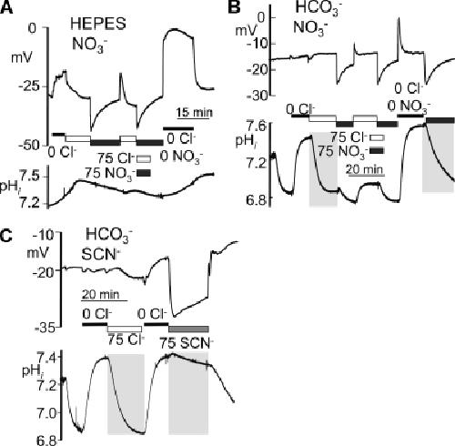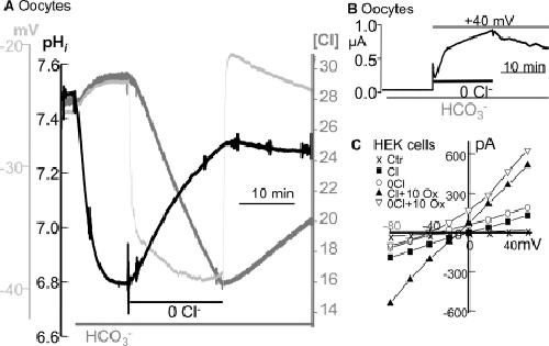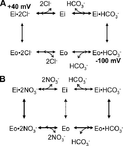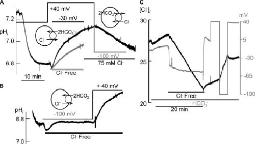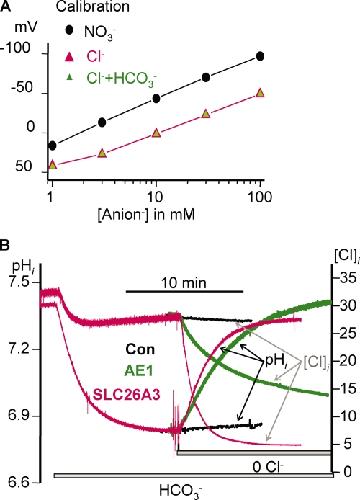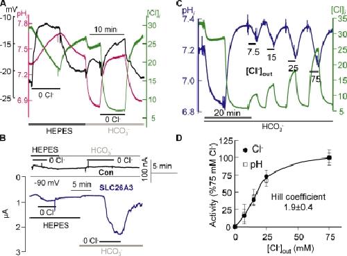 Coupling modes and stoichiometry of Cl-/HCO3- exchange by slc26a3 and slc26a6.,