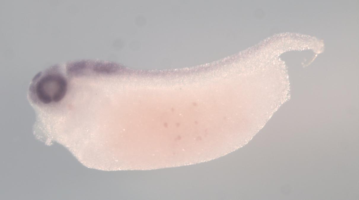 Larger Image fsd1l (fibronectin type III and SPRY domain containing 1-like) gene expression in X. laevis embryo, assayed via in situ hybridization, NF stage 33 & 34, lateral view, anterior left, dorsal up. Copyright © Perron Lab
