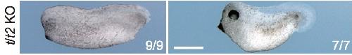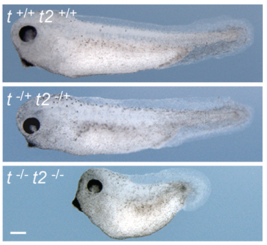 Tailess. Homozygous tailbud stage embryos tbxt (t, Xbra) -/- tbxt.2 (t2,Xbra3) -/- ) do not develop any tail. |