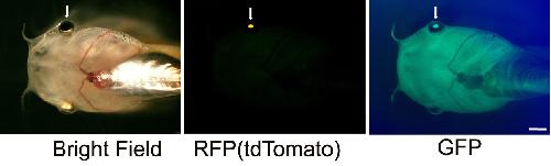 Map of the heat-shock-inducible Dkk1GFP transgene with lens labeling. The bright RFP variant, tdTomato under control of the 2.2-kb γ–crystallin promoter, was introduced downstream of hsp70-Dkk1GFP.