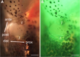 hsDkk1 inhibited the forelimb bud regeneration in tadpoles. (A and B) Dorsal view of the left forelimb bud at stage 54. A paddle-shaped forelimb bud can be seen in a cavity dorsal to the posterior portion of the gill region (A). The hsDkk1GFP expression was induced in the entire tadpole body, including the forelimb bud region, by heat-shock (B).