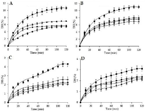 Figure 1. Degree of hydrolysis of H. poli, H. tubulosa, H. arguinensis, and H. sanctori, using Alcalase 2.4 L and Neutrase 0.8 L at 2% and 5%. The error bars represent standard deviation of means ± SD of at least three hydrolysis (n = 3) for each sea cucumber and at each enzyme concentration. (A): Degree of hydrolysis with Alcalase 2.4L at 2%; (B): Degree of hydrolysis with Alcalase 2.4L at 5%; (C): Degree of hydrolysis with Neutrase 0.8 L at 2%; (D): Degree of hydrolysis with Neutrase 0.8 L at 5%.