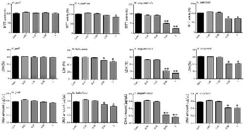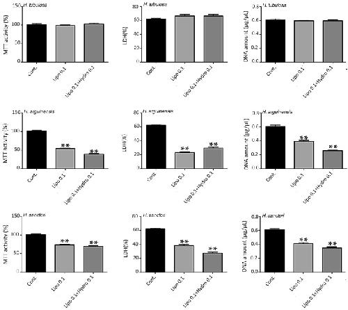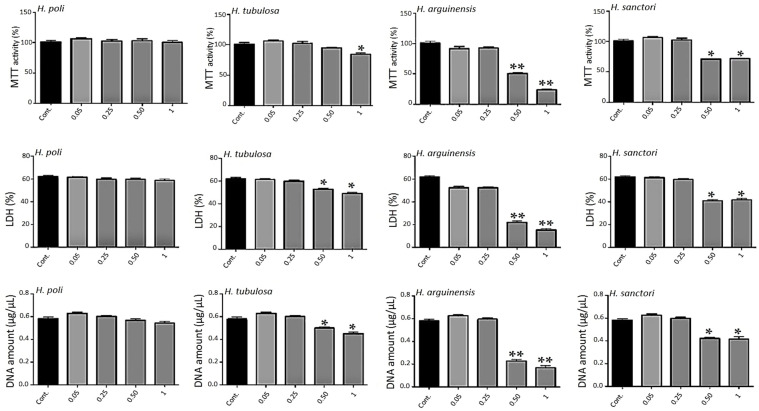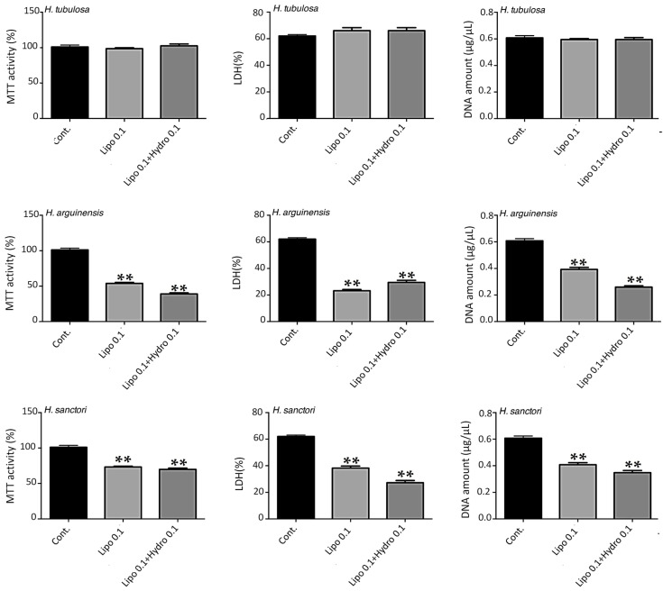 Figure 3. Impact of nanoliposomes without hydrolysates (Lipo 0.1) and with hydrolysates (Lipo 0.1+ Hydro 0.1) on human MSC. Human MSCs were exposed to nanoliposomes alone (0.1 mg/mL) or hydrolysates in nanoliposomes (0.1 mg/mL) for 7 days. Metabolic activity was assessed using an MTT assay, LDH release was determined as described under the Materials and Methods section, DNA concentrations were measured to estimate the proliferation of the cells. The results shown for H. poli, H. tubulosa, H. arguinensis, and H. sanctori are mean ± SD of at least three individual experiments. ** p < 0.001 compared to control for each point. The control condition for MSC metabolic activity was used as the reference value.