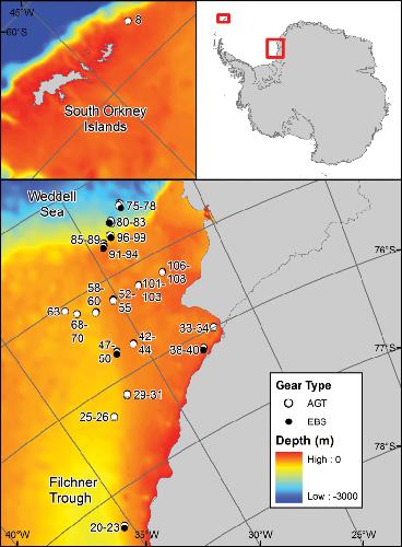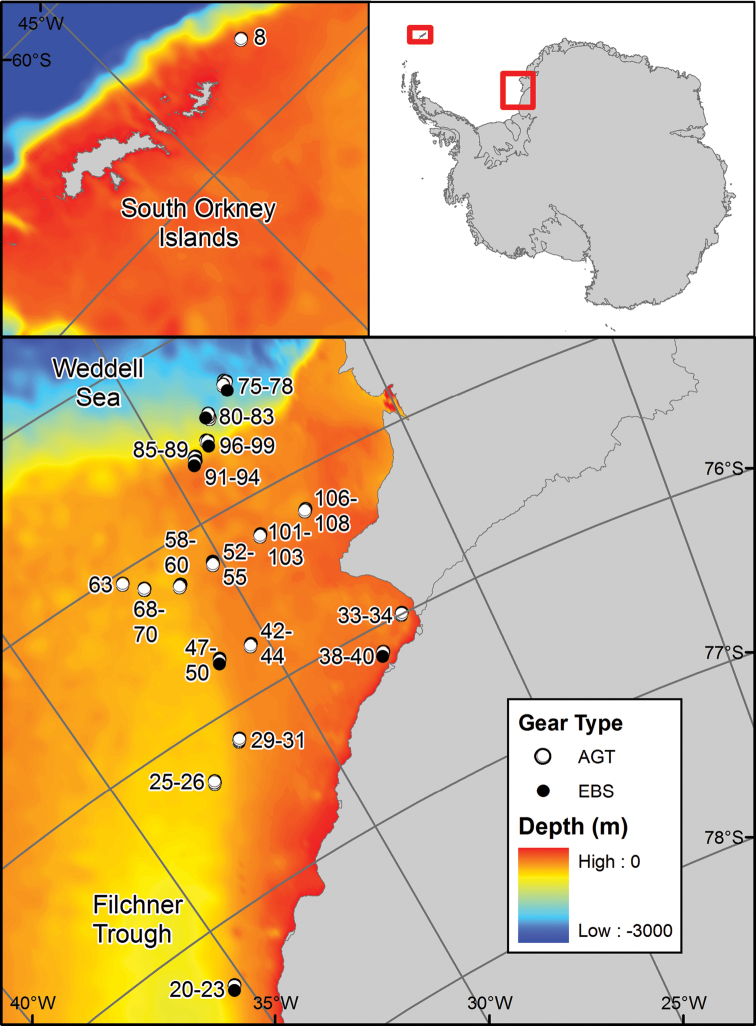 Information regarding the echinoids in this dataset is based on the Agassiz Trawl (AGT) and epibenthic sledge (EBS) samples collected during the British Antarctic Survey cruise JR275 on the RRS James Clark Ross in the austral summer 2012. A total of 56 (1 at the South Orkneys and 55 in the Eastern Weddell Sea) Agassiz Trawl and 18 (2 at the South Orkneys and 16 in the Eastern Weddell Sea) epibenthic sledge deployments were performed at depths ranging from ~280 to ~2060 m. This presents a unique collection for the Antarctic benthic biodiversity assessment of an important group of benthic invertebrates. In total 487 specimens belonging to six families, 15 genera, and 22 morphospecies were collected. The species richness per station varied between one and six. Total species richness represents 27% of the 82 echinoid species ever recorded in the Southern Ocean (David et al. 2005b, Pierrat et al. 2012, Saucède et al. 2014). The Cidaridae (sub-family Ctenocidarinae) and Schizasteridae are the two most speciose families in the dataset. They comprise seven and nine species respectively. This is illustrative of the overall pattern of echinoid diversity in the Southern Ocean where 65% of Antarctic species belong to the families Schizasteridae and Cidaridae (Pierrat et al. 2012).