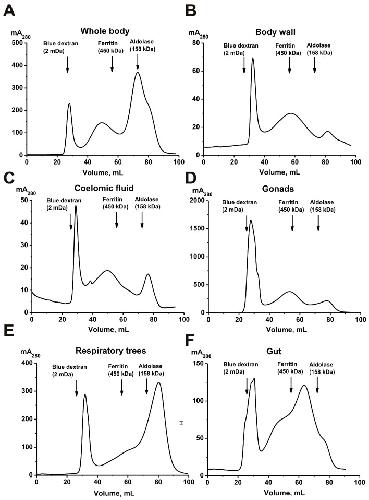 Figure 1. Isolation of protein complexes from the sea cucumber P. chilensis by FPLC gel filtration on a Sepharose 4B column using homogenates of intact sea cucumbers (A) and their different organs and tissues: body wall (B), coelomic fluid (C), gonads (D), respiratory trees (E), and gut (F).