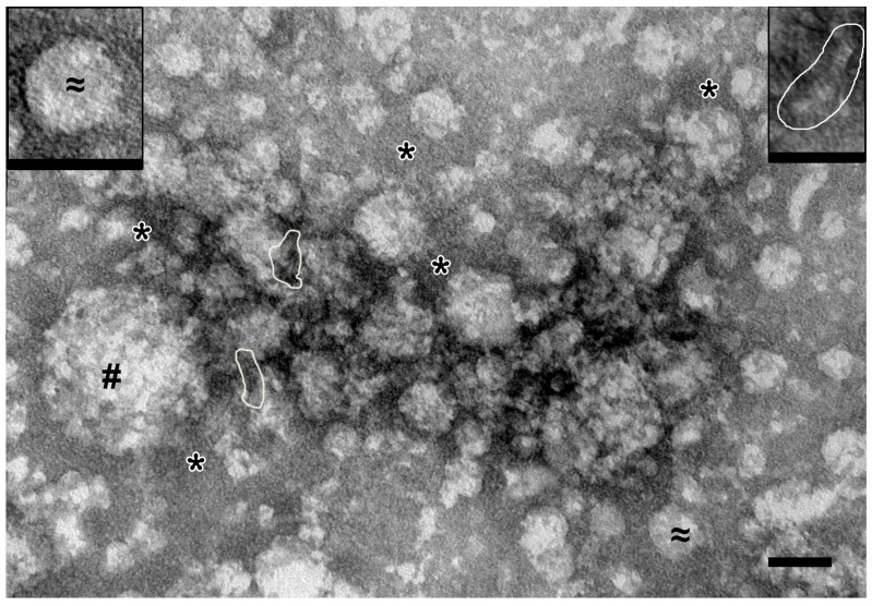 Figure 2. Representative image of complexes obtained by ultracentrifugation from full holothurian body including visceral organs. #—spherical particles of 40–140 nm (protein complexes); ≈ and insert—spherical particles of 30–40 nm (protein complexes); *—fine background material; stacks of “sticks” are shown by contour. TEM, negative staining by uranyl acetate. Length of scale bars corresponds to 50 nm.