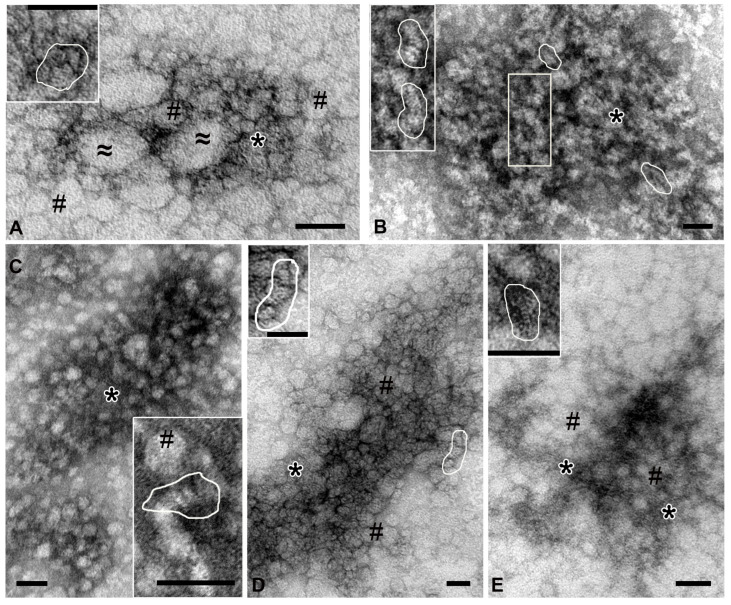 Figure 3. Representative images of complexes obtained by ultracentrifugation from different holothurian organs. (A)—coelomic fluid: #—spherical particles 20–30 nm; ≈—oval particles, up to 200 nm; *—an accumulation of small elements not organized into distinct structures. (B)—gut: stacks of “sticks” are shown in frames; *—accumulation of elements. (C)—respiratory trees: #—spherical particles; *—fine-grained material. (D)—gonads: #—spherical particles; *—accumulation of elements. (E)—body wall: #—spherical particles; *—fine-grained material. In all images, contours show stacks of “sticks”. Transmission electron microscopy, negative contrast. Length of scale bars corresponds to 50 nm.