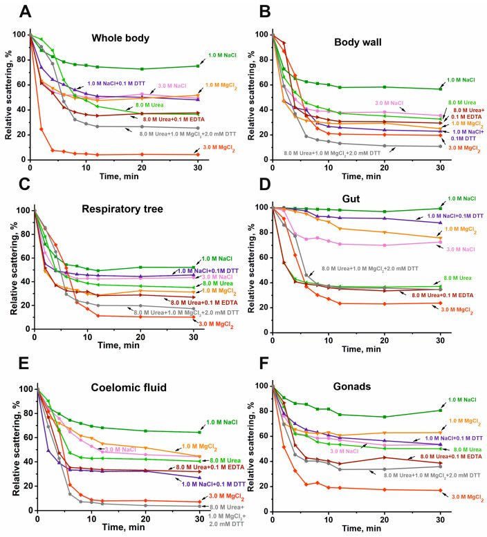Figure 4. DLS data on typical examples of changes in the relative stability of the complexes (0.005–0.01 mg/mL) from the whole body (A), body wall (B), respiratory trees (C), gut (D), coelomic fluid (E), and gonads (F) in different conditions.