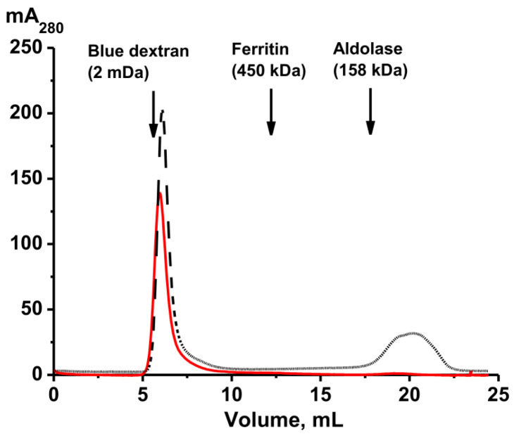 Figure 5. Gel filtration on Sepharose 4B of the whole-body complex before (red line) and after (black line) its treatment under severe conditions (8.0 M urea containing 1.0 M NaCl).
