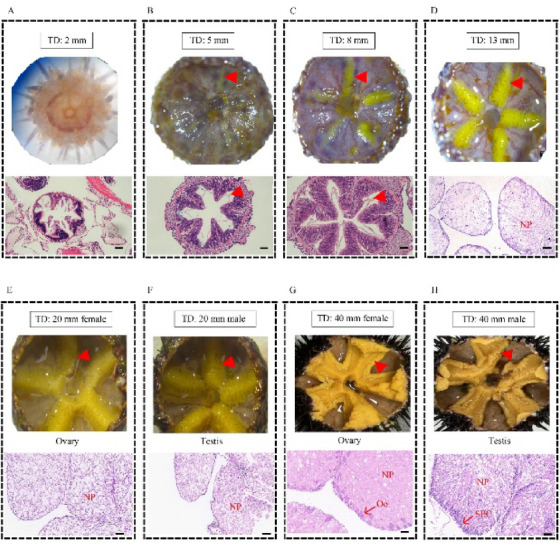 Fig. 1. Morphological and histological observations of juvenile gonads in sea urchins. Morphological observations based on anatomical dissection (top panels) and paraffin sections of gonads (bottom panels). Red triangles indicate the gonads. (A–D) represent M. nudus individuals with test diameters (TD) of 2, 5, 8, and 13 mm, respectively. (E, F) represent female and male sea urchins with a TD of 24 mm, and (G, H) represent female and male sea urchins with a TD of 40 mm. TD, test diameter; NP, nutritive phagocytes; Oo, oogonia; SPC, spermatocyte. Bar = 50 µm.