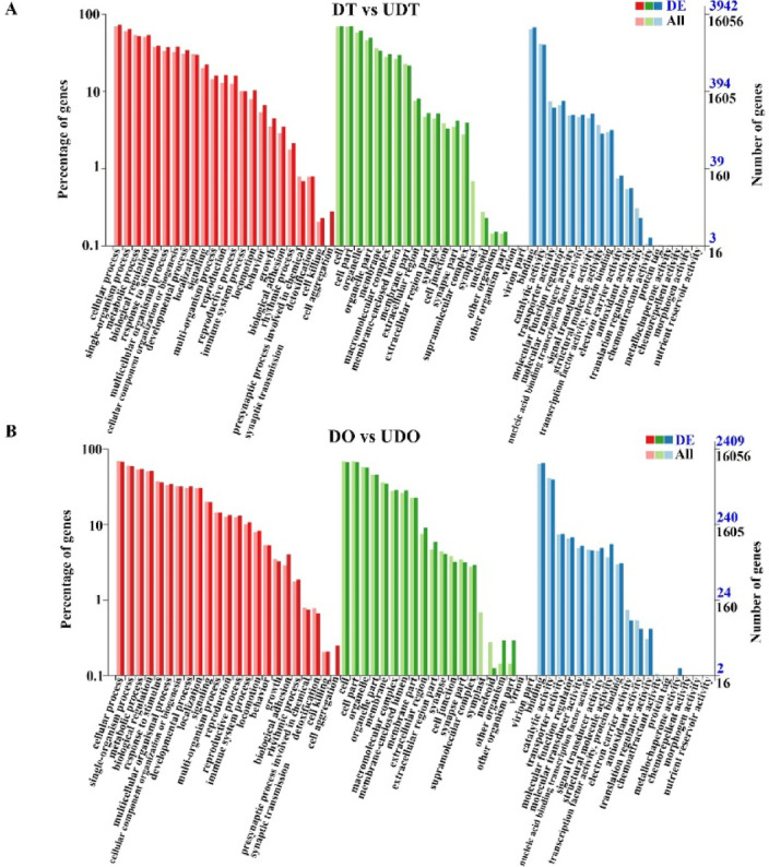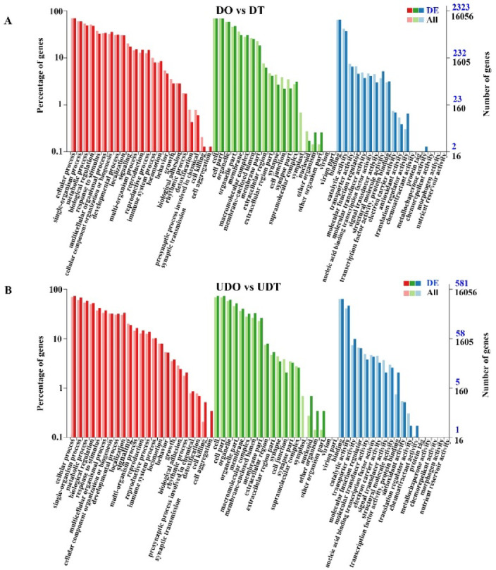 Fig. 3. GO term enrichment analysis was performed for the DEGs between the compared gonadal groups. (A) GO term enrichment analysis of DEGs between differentiated testes and undifferentiated testes. (B) GO term enrichment analysis of DEGs between differentiated ovaries and undifferentiated ovaries.