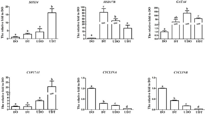 Fig. 5. Validation of six key differentially expressed genes in M. nudus by qRT-PCR. Data are expressed as the mean ± standard deviation (SD) of three replicates. DO, differentiated ovaries; DT, differentiated testes; UDO, undifferentiated ovaries; UDT, undifferentiated testes. Identical letters indicate no significant differences among individuals, whereas different letters denote significant differences (p < 0.05).