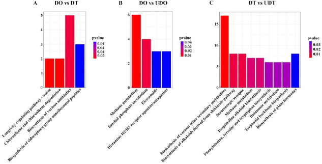 Fig. 6. KEGG pathway analysis of DEMs between the compared gonadal groups. The vertical axis represents the number of DEMs associated with each pathway, while the horizontal axis indicates the KEGG significantly pathways enriched by DEMs. Pathway maps are based on the KEGG database 42–44.