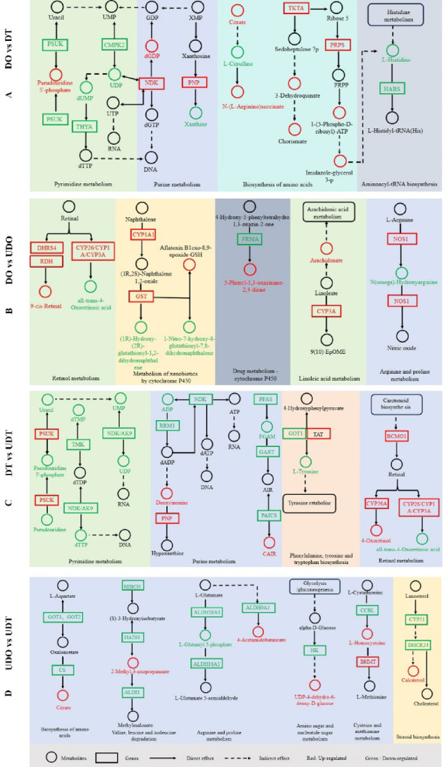 Fig. 7. An integrative metabolic network map constructed from differentially expressed genes and metabolites between the compared gonadal groups. (A) DO vs DT group. (B) DO vs UDO group. (C) DT vs UDT group. (D) UDO vs UDT group. DO, differentiated ovaries; DT, differentiated testes; UDO, undifferentiated ovaries; UDT, undifferentiated testes. Differentially expressed genes (DEGs) are represented by boxes, and differentially expressed metabolites (DEMs) are represented by circles. Red indicates upregulation, while green indicates downregulation.