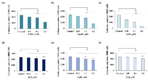 Figure 3. The effect of 2-DG, CucD, SpD, SpF, SpH, and SpI from the starfish S. pacificus on the colony formation in TNBC cells MDA-MB-231. MDA-MB-231 cells were treated with (a) 2-DG at concentrations of 0.1, 0.5, and 2.5 mM; (b) CucD; (c) SpD; (d) SpF; (e) SpH; (f) SpI at concentrations of 0.05, 0.1, and 0.2 µM in soft agar. The number of colonies was counted under a Motic AE 20 microscope (total magnification of 10×) using ImageJ version 1.50i software bundled with 64-bit Java 1.6.0_24. Results are presented as mean ± standard deviation (SD). The asterisks indicate a significant decrease in the number of colonies in MDA-MB-231 cells treated with different concentrations of 2-DG and triterpene glycosides from the starfish S. pacificus as compared to DMSO-treated cells (control) (* p < 0.05; ** p < 0.01; *** p < 0.001). |