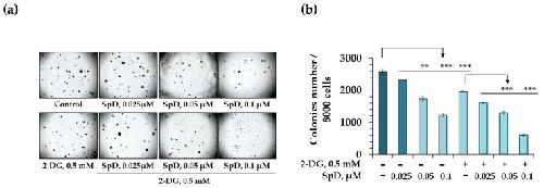 Figure 4. The effect of SpD from the starfish S. pacificus in combination with 2-DG on the colony formation in TNBC cells MDA-MB-231. (a,b) MDA-MB-231 cells were pre-treated with 2-DG at concentrations of 0.5 mM and then treated with SpD at concentrations of 0.025, 0.05, and 0.1 µM in soft agar. The number of colonies was counted under a Motic AE 20 microscope (total magnification of 10×) using ImageJ version 1.50i software bundled with 64-bit Java 1.6.0_24. Results are presented as mean ± standard deviation (SD). The one-way ANOVA and the Tukey’s HSD test for multiple comparisons show statistical significance as compared to DMSO-treated cells (control) or 2-DG-treated cells (** p < 0.01; *** p < 0.001). |
