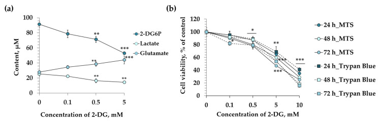 Figure 2. The effect of 2-DG on the metabolic profile, cell viability, and proliferation of TNBC cells MDA-MB-231. (a) MDA-MB-231 cells (5 × 103 cells/200 µL) were treated with either DMSO (vehicle control) or 2-DG at 0.1, 0.5, 5 mM and incubated for 24 h. The ability of MDA-MB-231 cells to take up glucose, excrete the lactate and glutamate, as determined by Glucose uptake or Lactate/Glutamate Glo assays. (b) MDA-MB-231 cells (1 × 104 cells/200 µL) were treated with either DMSO (vehicle control) or 2-DG at 0.1, 0.5, 5, and 10 mM and incubated for a time point of 24, 48, or 72 h as compared to DMSO-treated cells (control). Cell viability was estimated by the MTS and trypan blue exclusion assays. Data show the mean of three independent experiments ± SD. The asterisks indicate (a) a significant changes in the content of 2-deoxy-D-glucose-6-phosphate (2-DG6P), lactate and glutamate or (b) a significant decrease in cell viability of MDA-MB-231 cells treated with different concentrations of 2-DG at one time point of 24 or 48 or 72 h as compared to DMSO-treated cells (control) (* p < 0.05; ** p < 0.01; *** p < 0.001). |