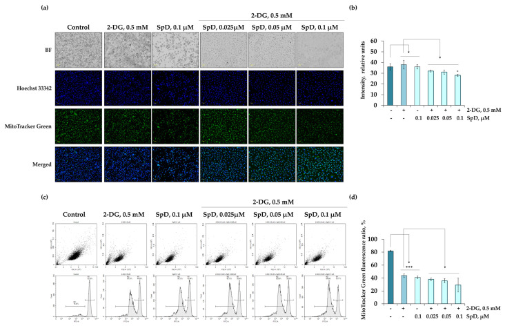 Figure 6. The effect of SpD from the starfish S. pacificus in combination with 2-DG on the alteration of mitochondrial mass in TNBC cells MDA-MB-231. MDA-MB-231 cells were treated with either 2-DG (0.5 mM) or SpD (0.1 µM) alone or by 2-DG (0.5 mM) in combination with SpD (0.025, 0.05, and 0.1 µM) and subjected to fluorescence microscopy and flow cytometry assays. (a) Fluorescence microscopic images were taken under CELENA® X High Content Imaging System (at a total magnification of 10×), aided with cell-integrated CELENA® X Cell Analyzer software version 1.6.0. (b) Fluorescence intensity of MitoTracker Green in MDA-MB-231 cells was determined by ImageJ version 1.50i software bundled with 64-bit Java 1.6.0_24. (c) Flow cytometry analysis of MDA-MB-231 cells stained with MitoTracker Green dye. (d) Quantitative calculation of the data obtained by NovoExpress flow cytometry software (version 1.6.1). Results are expressed as mean ± SD. The one-way ANOVA and the Tukey’s HSD test for multiple comparisons show statistical significance as compared to DMSO-treated cells (control) or 2-DG-treated cells (* p < 0.05; *** p < 0.001). |