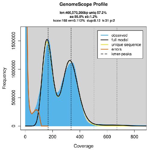 k-mers generated using GenomeScope2. The plot shows observed and modelled