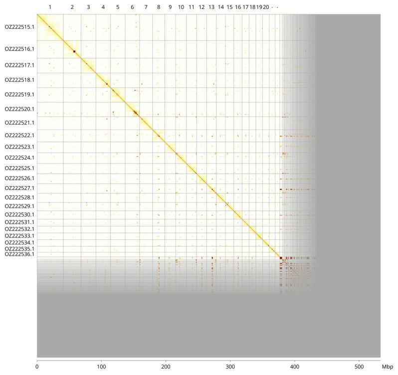 Anseropoda placenta genome assembly.Assembled chromosomes are shown in order of size and labelled along the axes, with a megabase scale shown below. The plot was generated using PretextSnapshot.